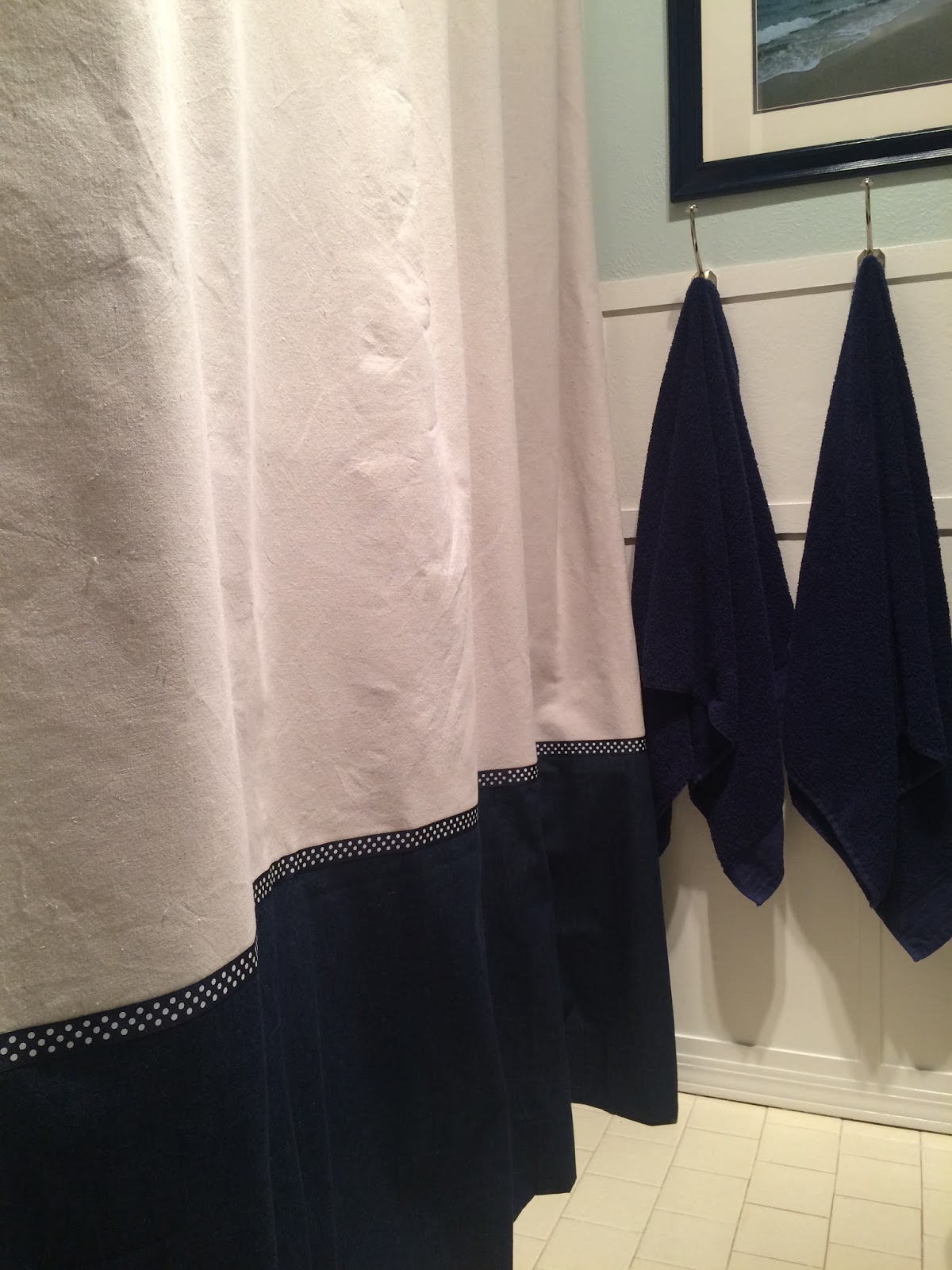 I made the shower curtain out of a dropcloth, some leftover denim chambray from my son’s room makeover, and ribbon for a little extra somethin’.