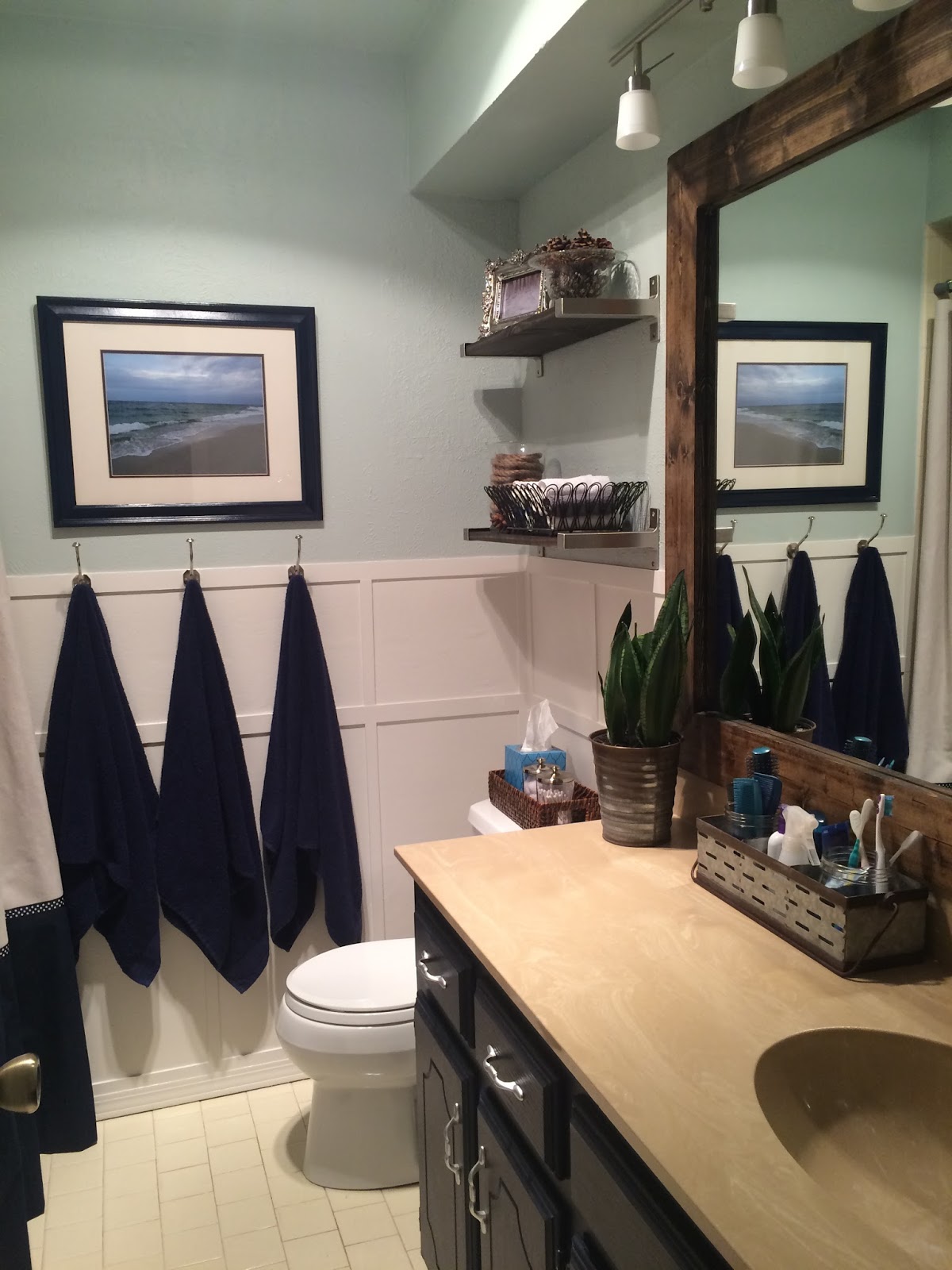 Your bathroom looks incredible! I love the navy vanity and the framed mirror. Love the light fixture.Such an amazing job in here!