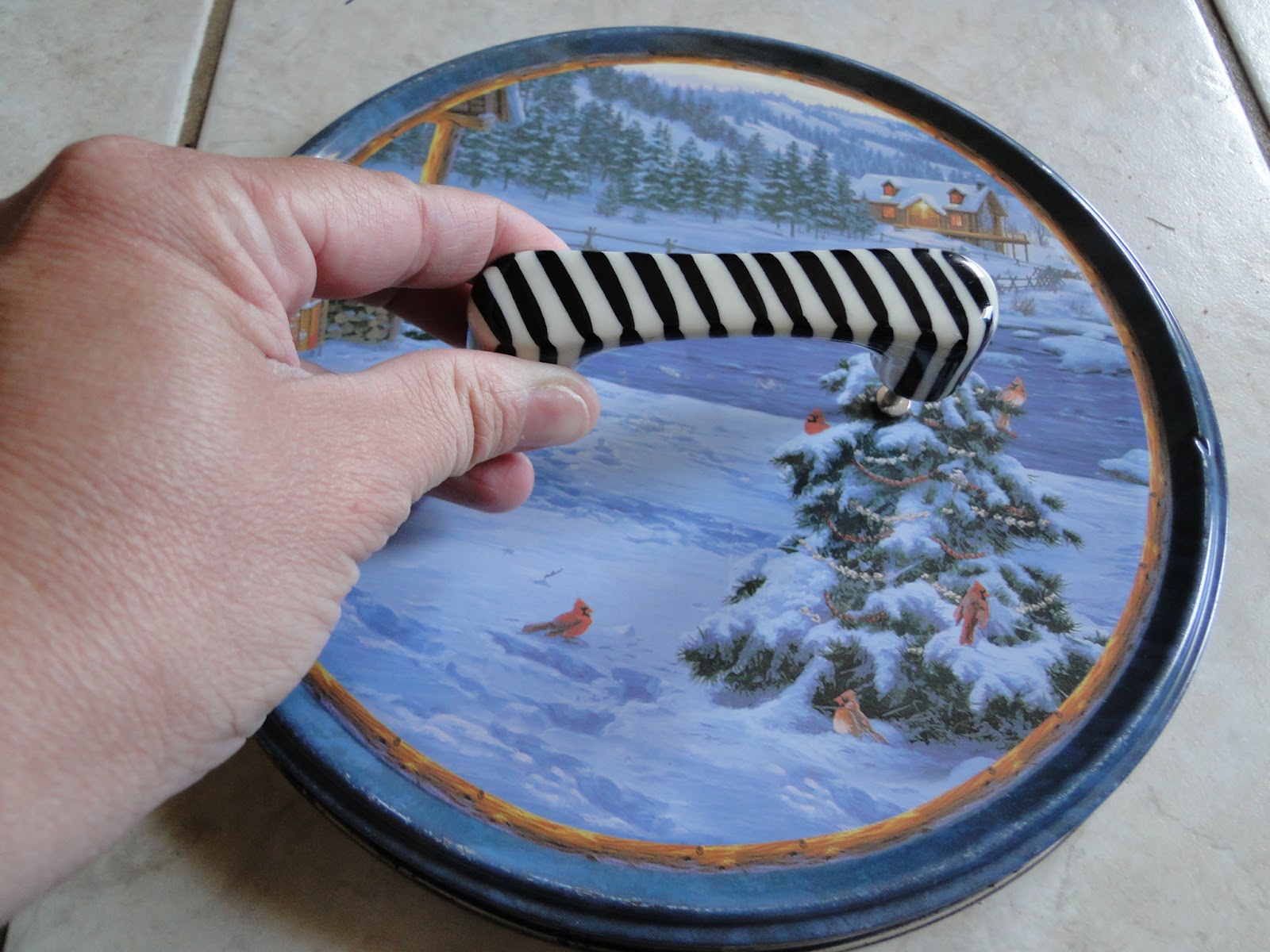 It’s functional but that’s about it. I had seen some cute things in stores and on pinterest and really how hard could it be. So, I got a hankerin to spray paint something and the tin was the victim. I finally found my favorite spray paint tool – won’t spray paint without it – have you seen these – genius. Home depot for around $5 or less – saves your fingers from getting paint all over them, and from getting a cramp!!