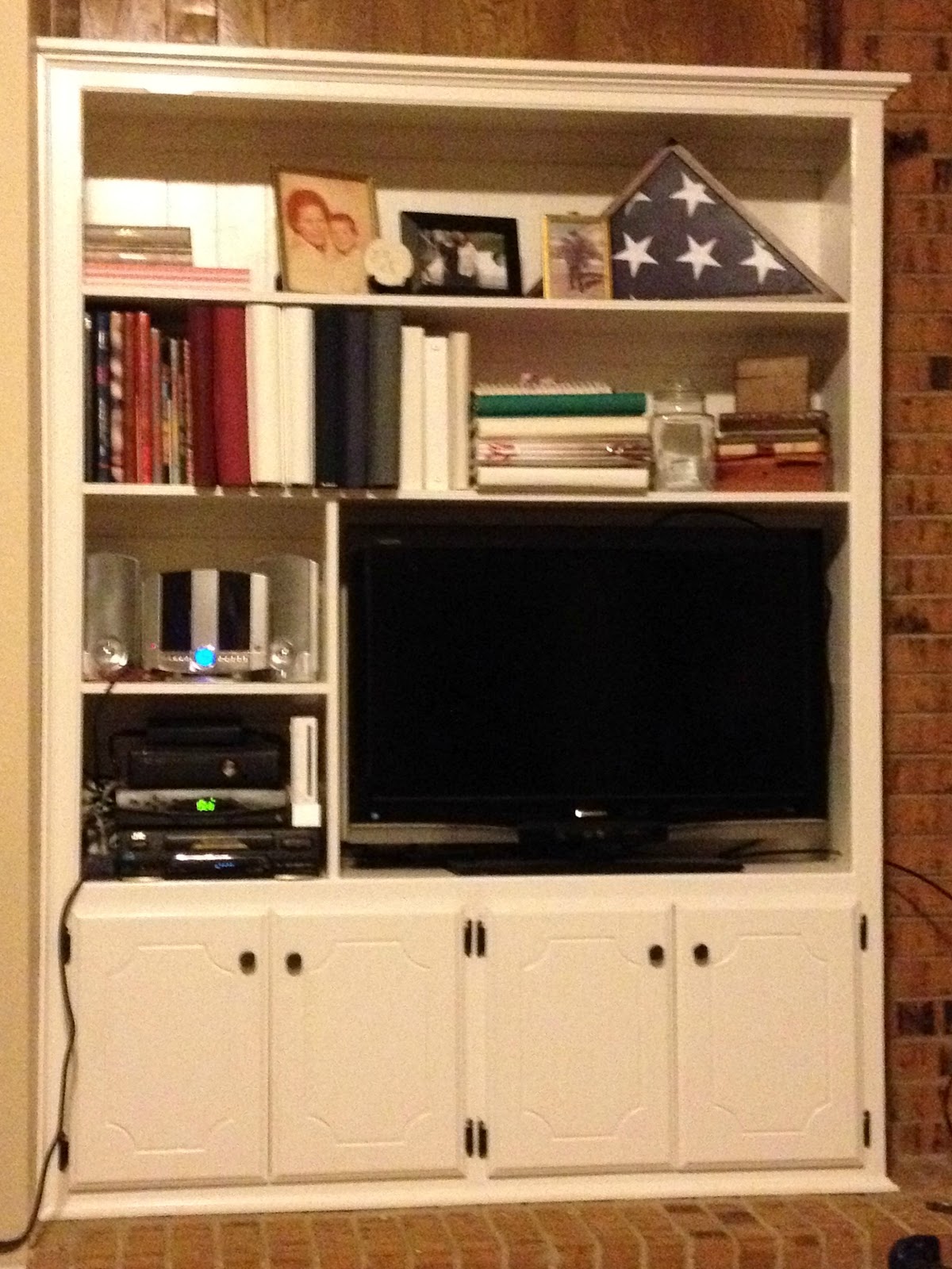 You can see on the bottom where I tested a couple of paint colors before I found one I liked. I ended up choosing Glidden Antique White. I went with the paint+primer because there was no way I was sanding all of that and I wanted to save a step. You can see how dark it is and that is with the lights on. (Forgive my photography skills, still learning how to use my camera.) By the way there is another built-in just like this on the other side of the room.