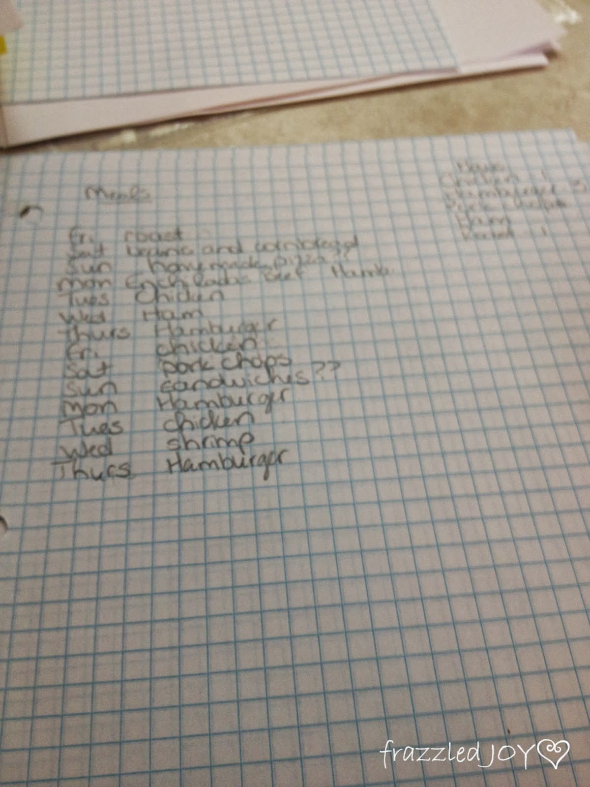 I pull out a couple of binders that have all of our family’s go-to recipes – family recipes, and some new ones I have tried which we now love. I also have my grocery list and a piece of paper to make my menu on, and our family calendar. The calendar allows me to know what nights we might have activities on, what nights we might be having dinner elsewhere or out for a special occasion. I meal plan for two weeks at a time because my hubby gets paid every two weeks. Maybe you want to tackle one week at a time at first. Some people plan for a month at a time. It really it whatever works for your family.