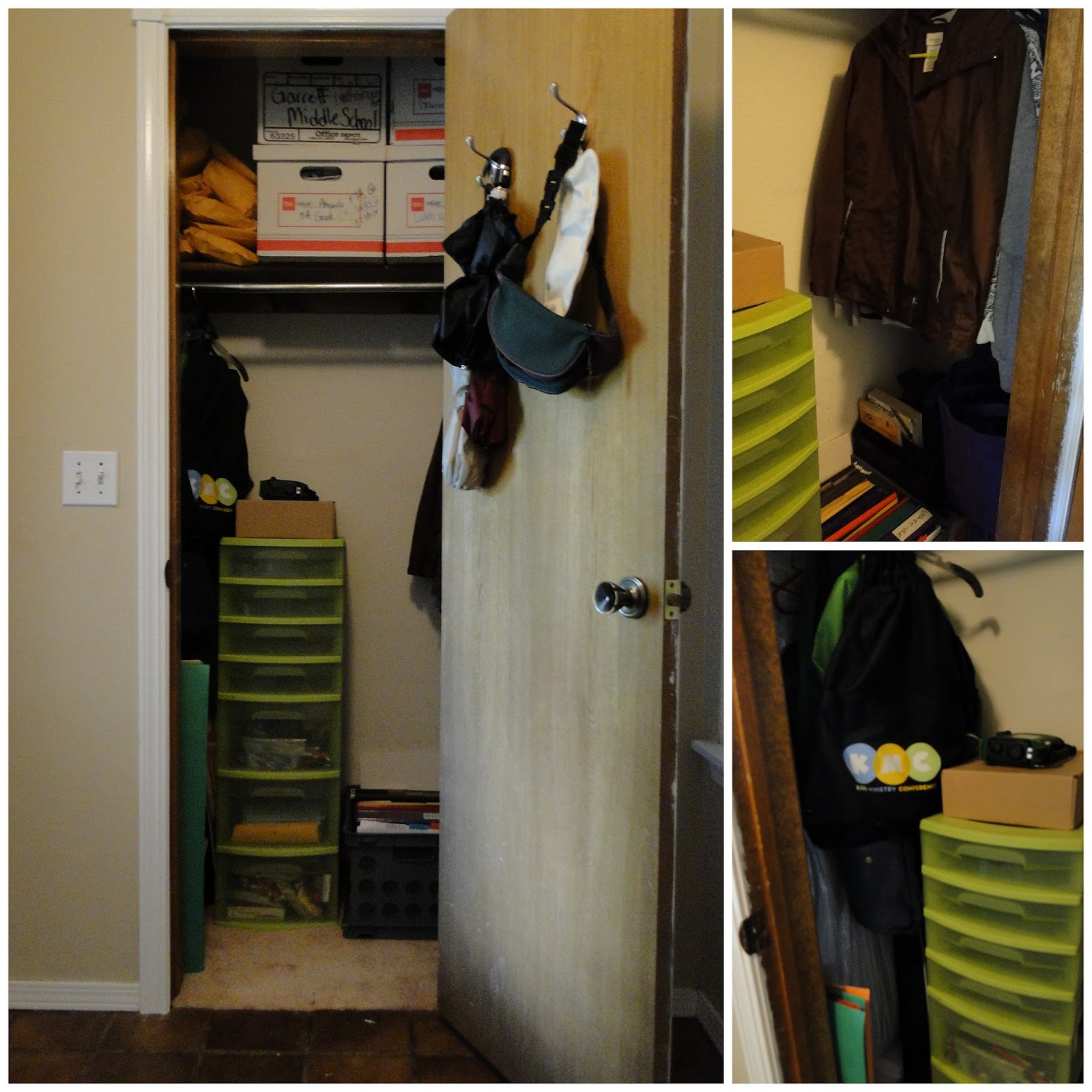 So after we tackled the garage, and rested for a few days just to recover, I decided to tackle another space that needed attention. You see, what helps me stay on task when I am de-cluttering and organizing one space, is that when I decided something needs to be relocated, I just relocate it haphazardly trying to move on as quickly as possible {unless of course that space is already organized then I know where the thing is to go}. I have mentioned that every corner of my home needs some TLC in the de-cluttering and organizing area so this is the only way I can stay focused and not get caught up doing a whole different project in the middle :). So, long story short behind this lovely door in my entryway,