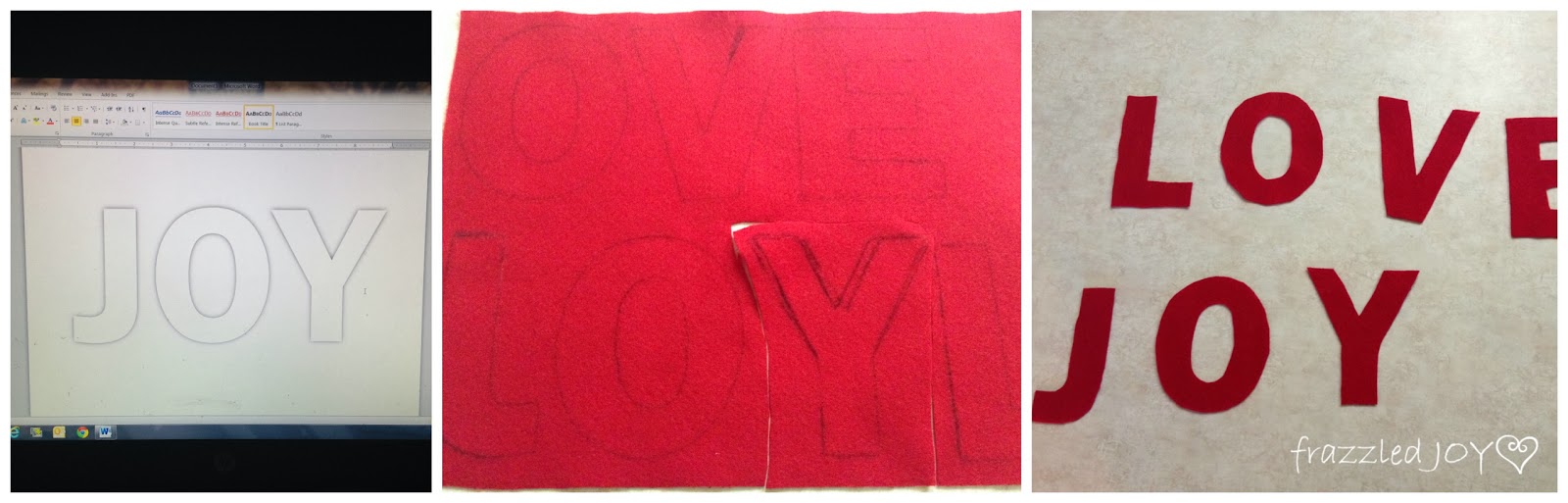 Then, I traced the letters onto a piece of felt. I traced them on backwards so that my pen marks wouldn’t show afterwards. Cut them out and moved on to the next step. I knew I was going to stitch them down, but I needed something to hold them in place while I stitched.