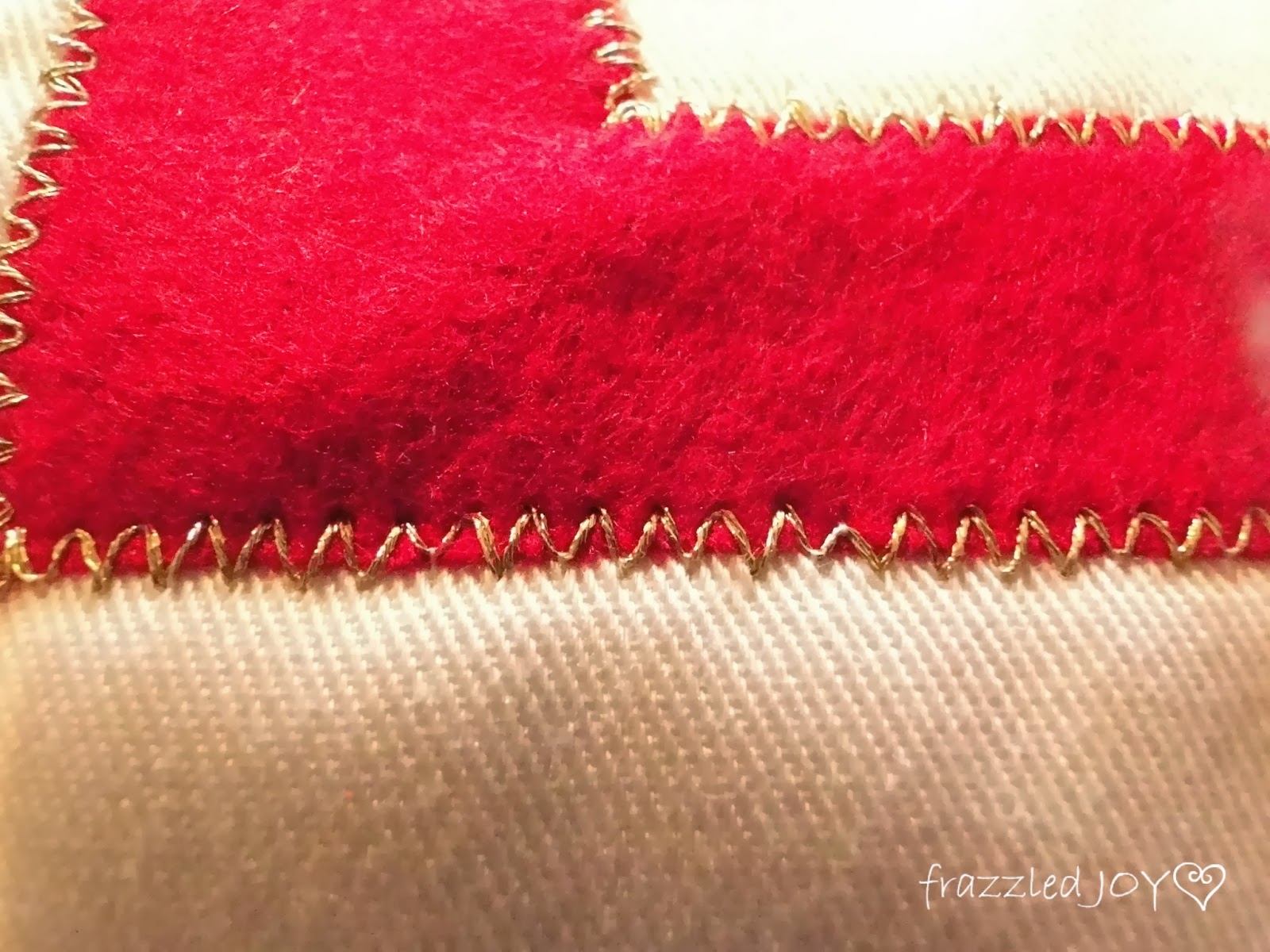 Next came the fun part. The stitching. I tried out several different decorative stitches on a scrap piece of fabric, but finally settled on a zig-zag stitch. I simply stitched around the edges of all the letters. I didn’t really want the stitching to be the center of attention, just an accent. And what an accent!!