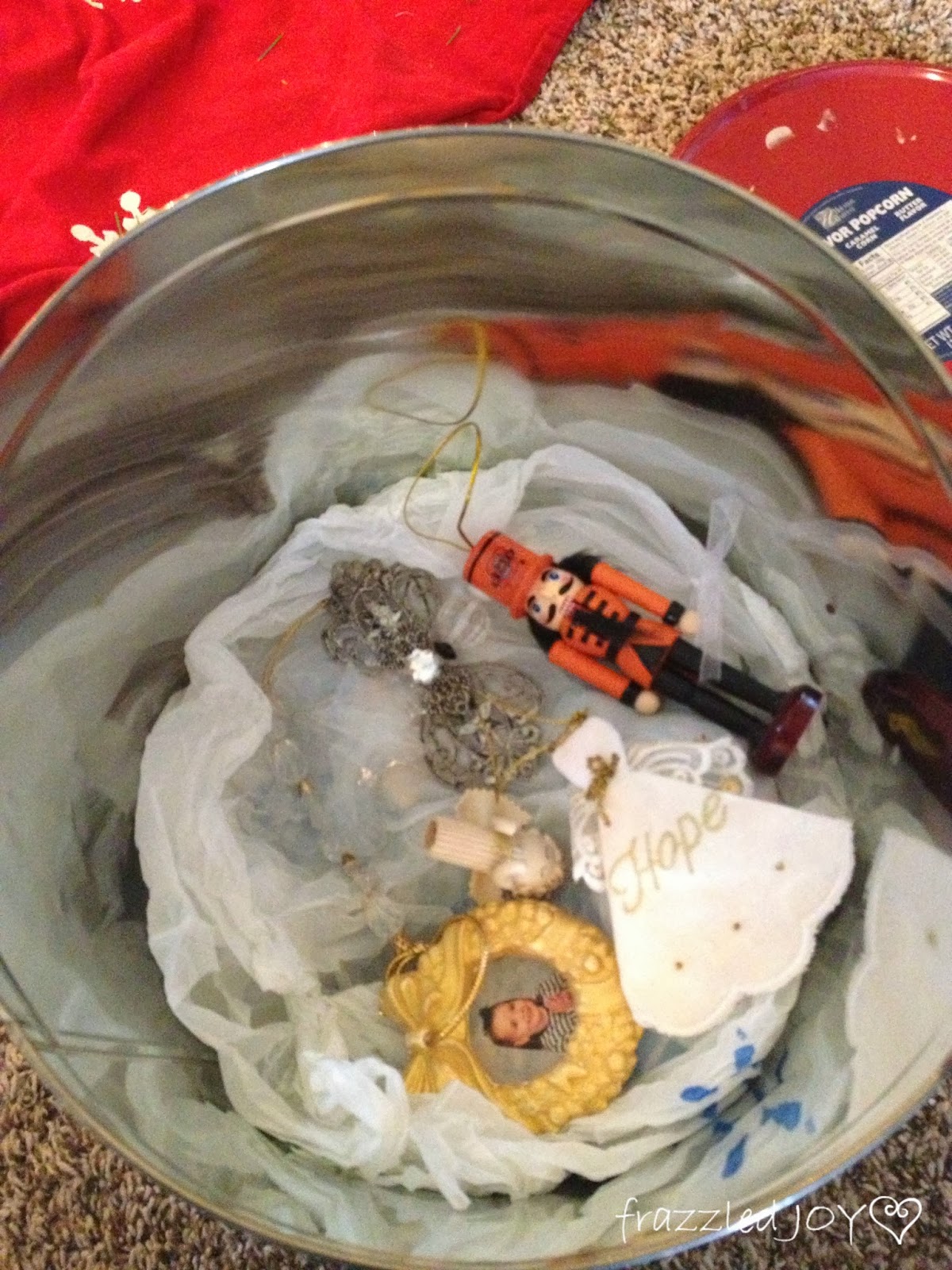 If you are looking for an easy, inexpensive way to store your ornaments, I have it!! One of my hubbies favorite things every Christmas season is buying himself a tin of popcorn to snack on. 🙂 One year, many moons ago, I got a wild notion that these would be perfect containers for our ornaments. And, every since then that’s exactly what we have used. It works out perfectly since every year I seem to add a few ornaments, and every year he purchases a new tin!! I like that they are small, so I don’t tend to cram them full, and things don’t seem to shift around much in there.