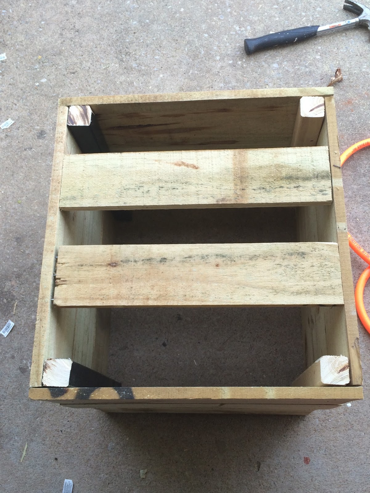 Then hubby cut a couple pieces of the regular picket to make cross pieces for the bottom – something for the pot to sit on so it could still drain.