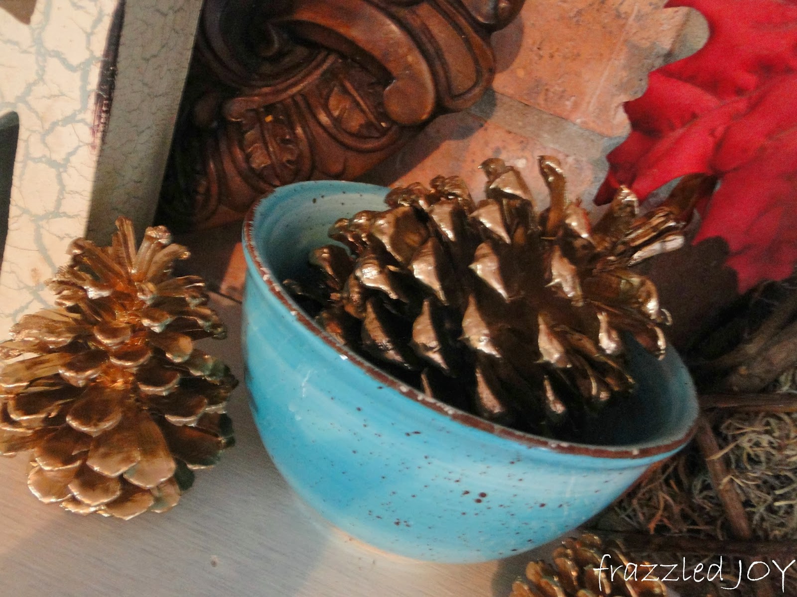 This weekend the weather finally felt like fall, and I enjoyed the cool temps so much!! It also, finally put me in the mood to pull out a few fall decorations. Combining a few things from last year with a few other finds from around the house, and of course my newly painted gold pine cones…here is my mantel for the fall. 🙂