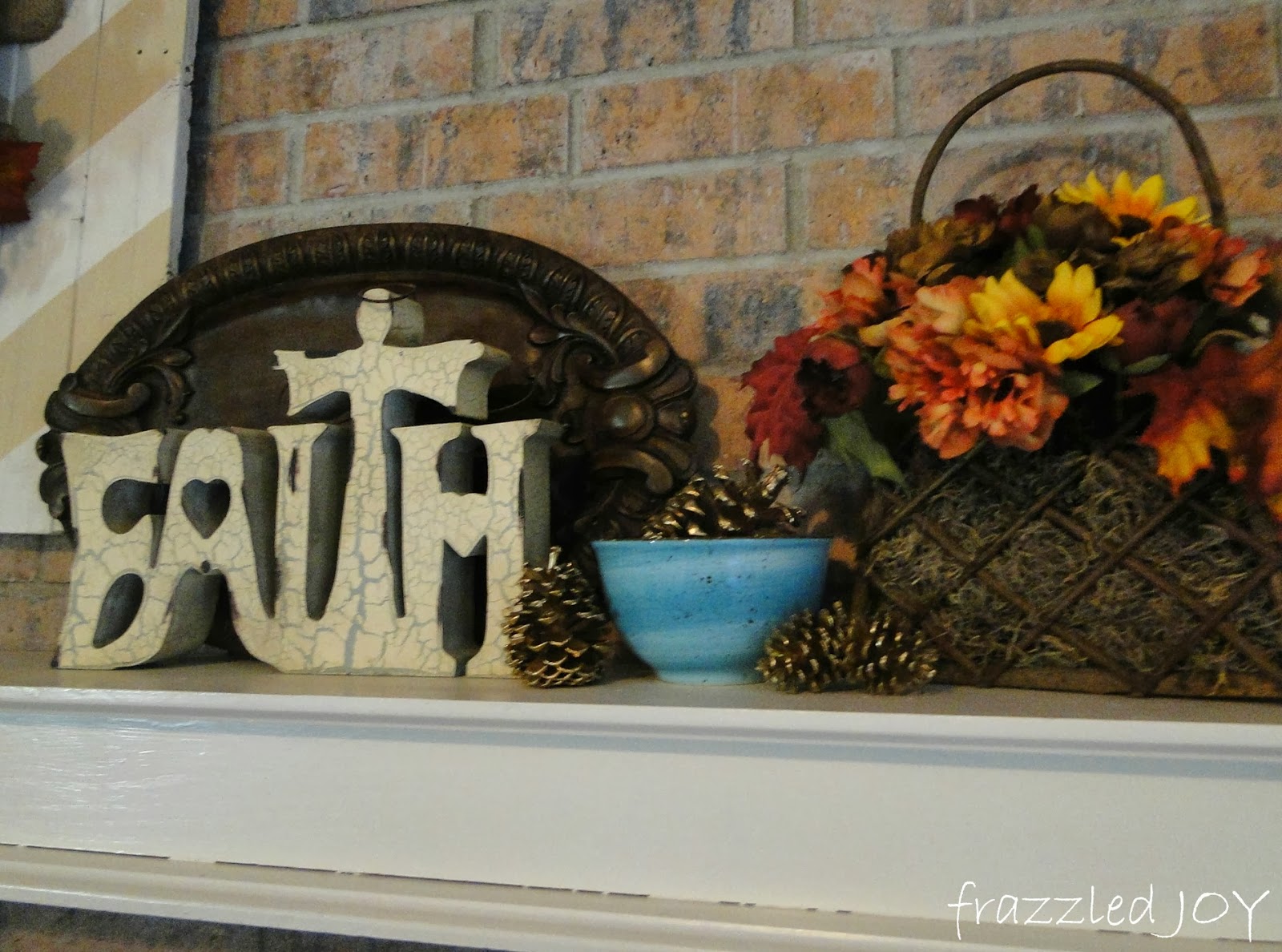 The other fall foliage and flower arrangement is something I did last year for somewhere else, but I decided to plop that on the mantel this year. The platter and Faith are things from other parts of the house that I pulled in. I wanted to break up the orange, yellow, white, cream, and brown colors, so I decided to use my turquoise bowl I bought when I was thrifting last month.