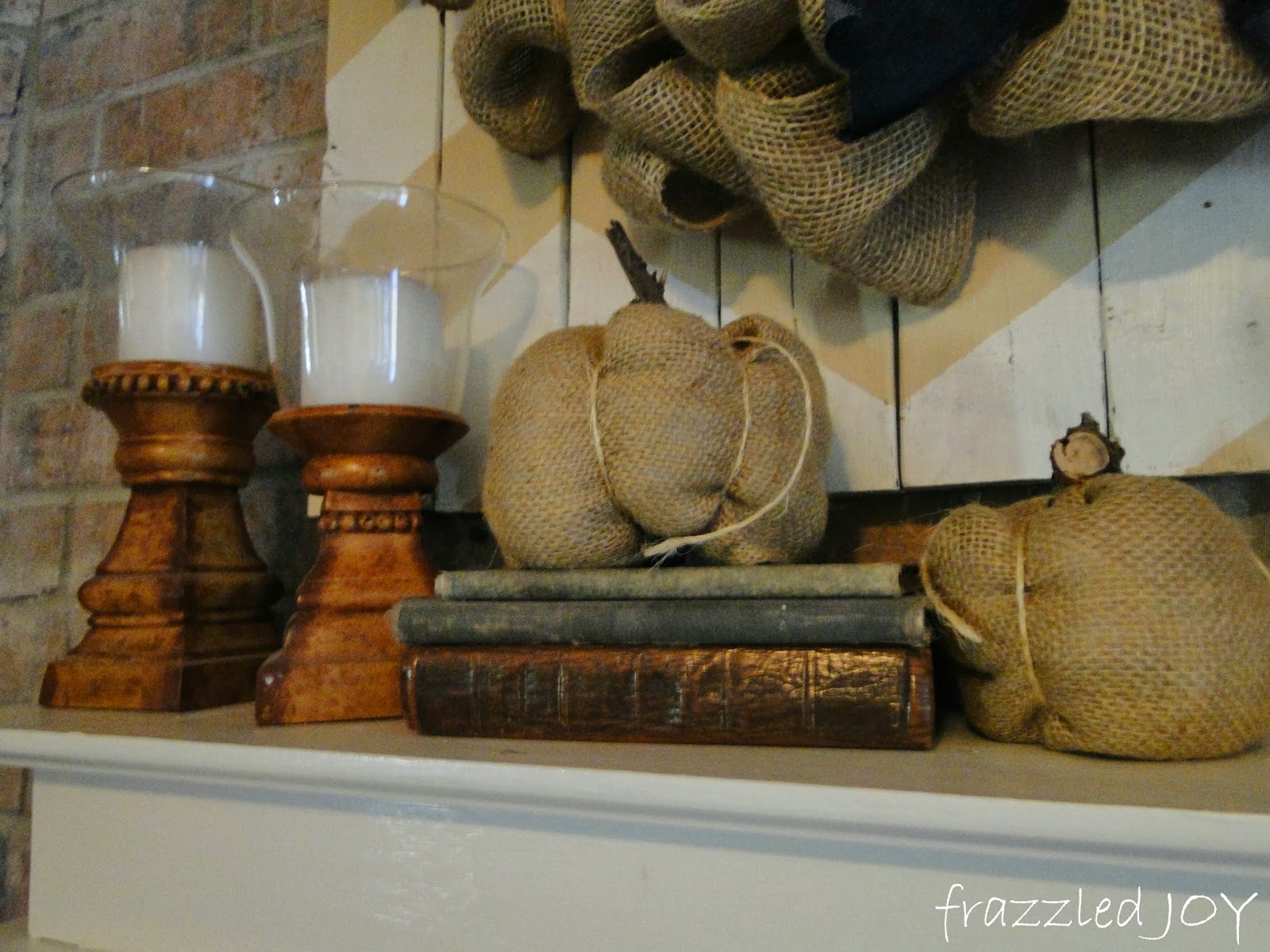 The candles sticks I’ve had for years, they were the right color and height, so they got to join the party too. Those cute burlap pumpkins I made last year, and the books – a bible and some small hymn books – belonged to Van’s grandma. I love the boost it brings to my pumpkin, but I also love the history they add.