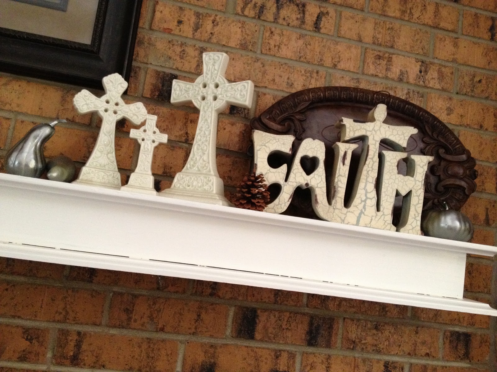 On the right side, I added a platter behind the “faith” to warm that up a bit. Then I added my dollar store pumpkins that I sprayed silver, and a couple of pine cones.