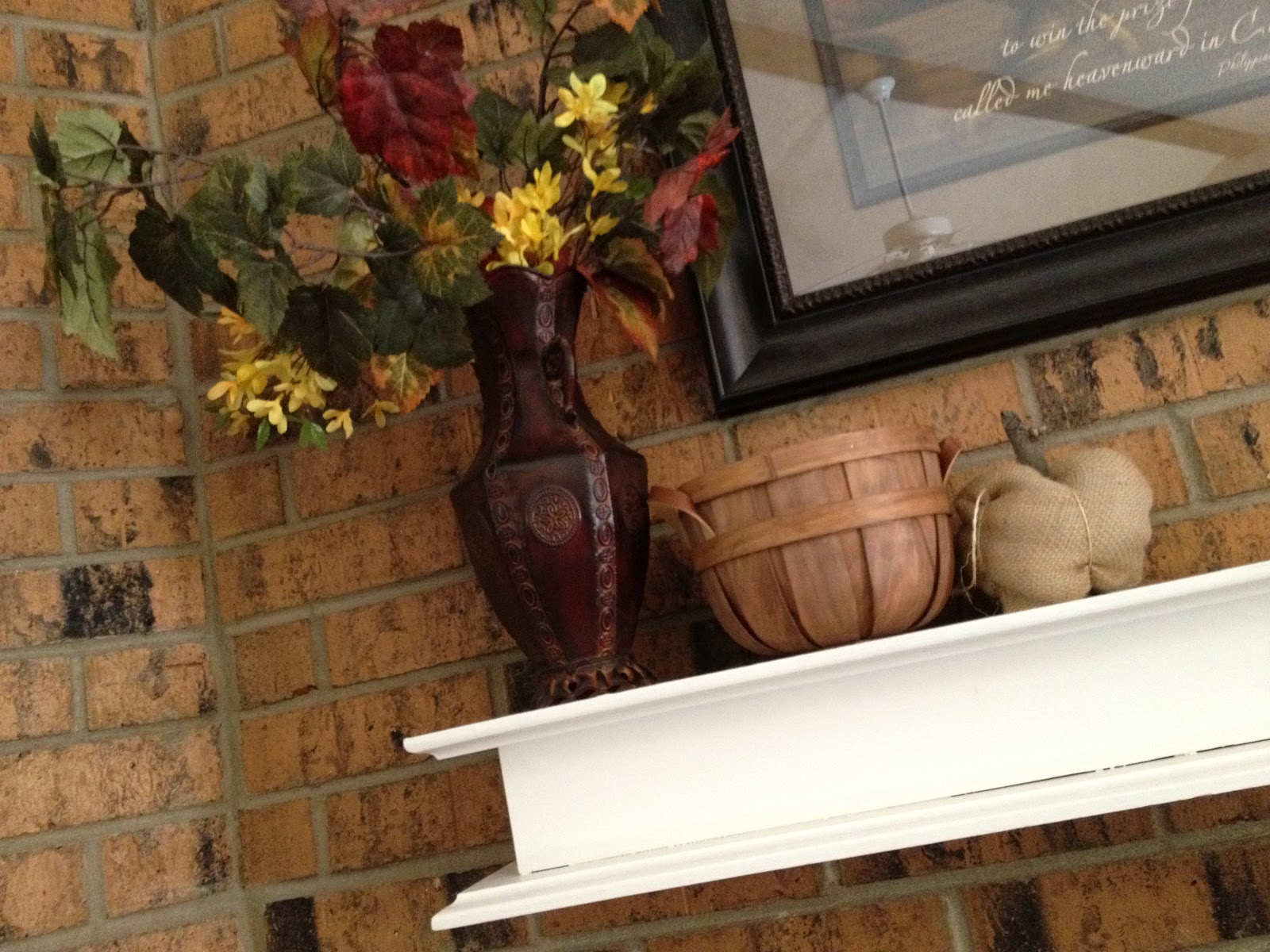 On the left side I pulled out a dark metal vase and toss in some fall leaves with the yellow flowers for a pop of color. Then I pulled out a cute apple basket, and next to that I placed my the burlap pumpkin that I made. Unfortunately I did not take pictures of that. But, you can find the instructions that I followed here.