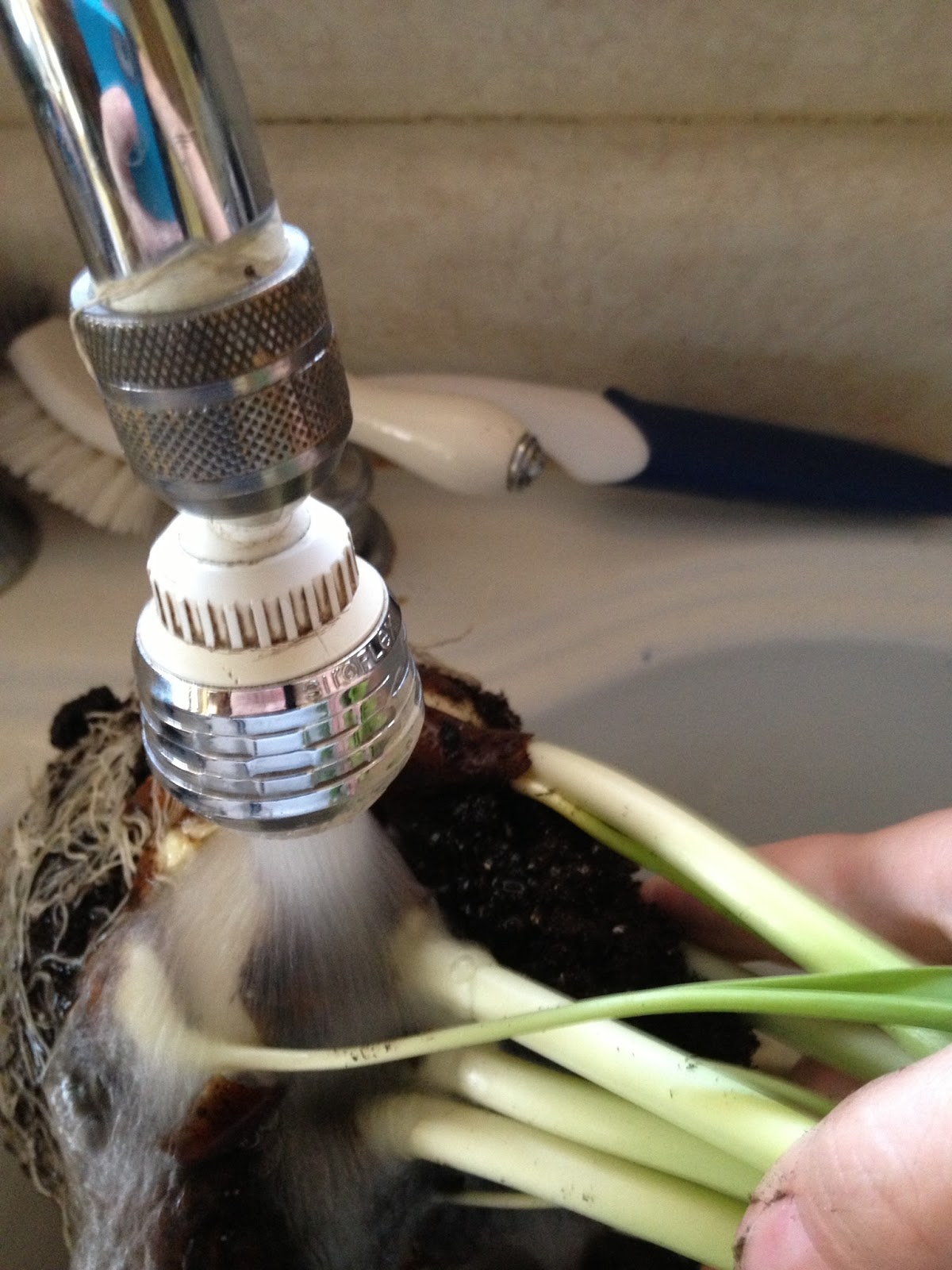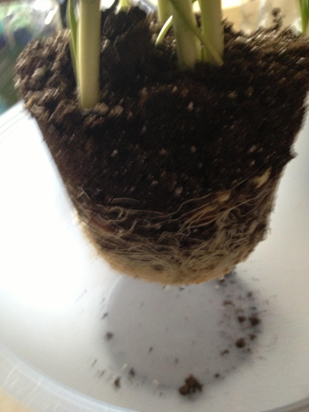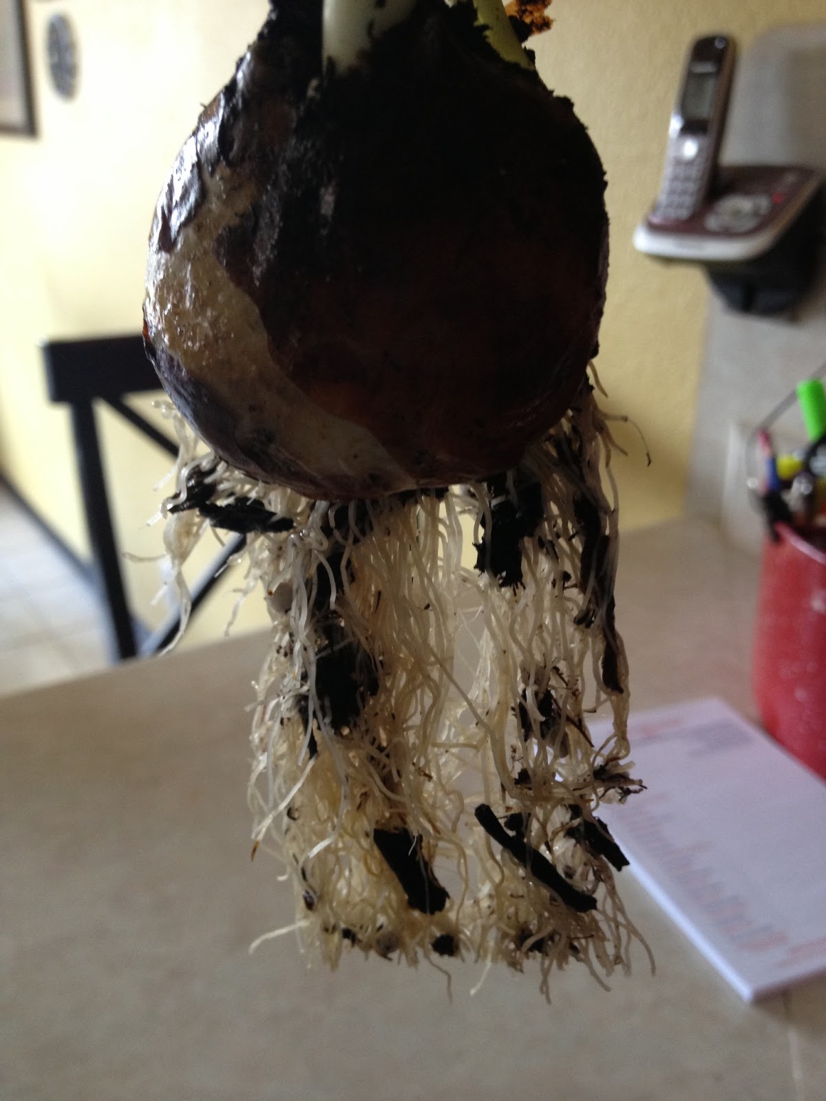 The first step is to remove the bulbs from the pot and the dirt. I was certain that I was killing them as I ripped apart the roots to free the bulbs. But, I just had to try. Hey, if it didn’t work – I only lost $4 ;).