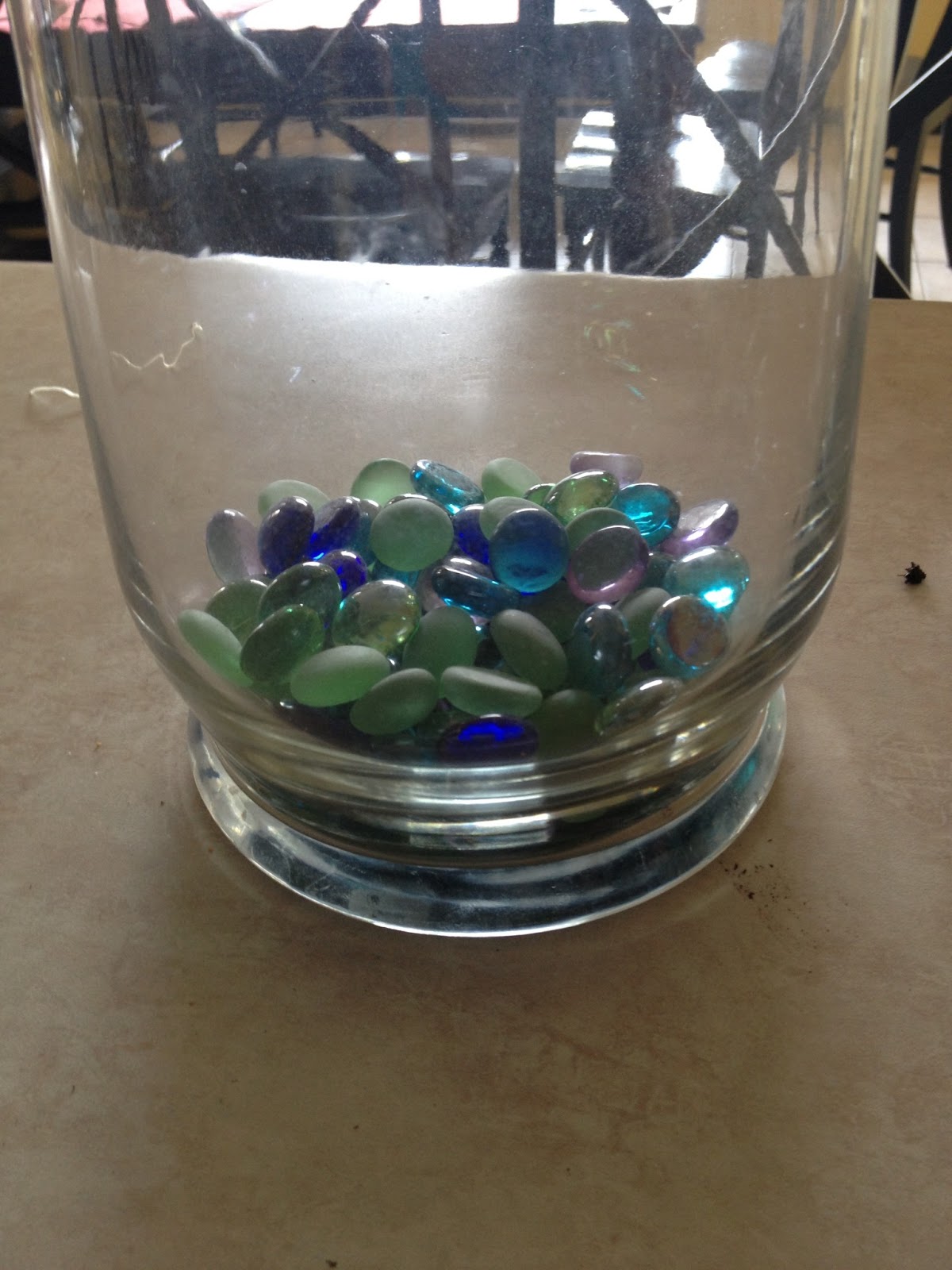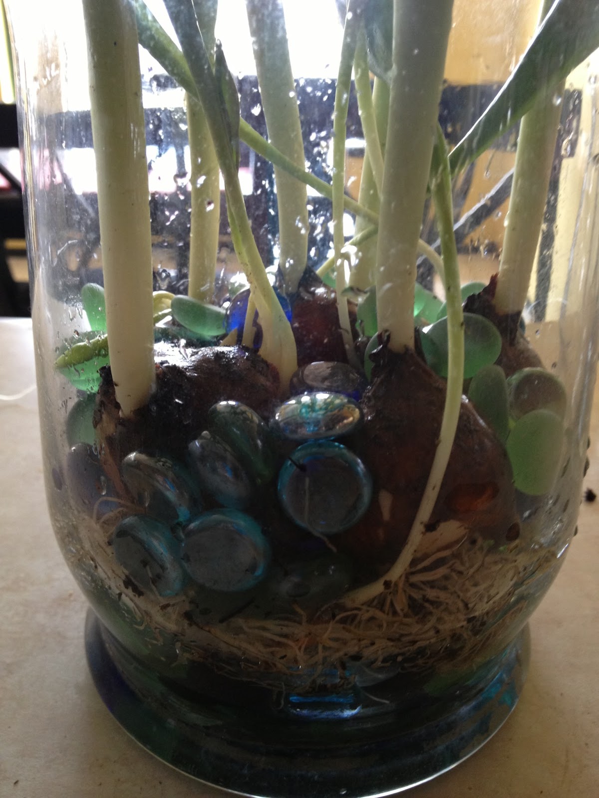 I did my best to get all the dirt off and trimmed the roots down as Kim instructed and then I started putting together the masterpiece. First place a couple of handfuls of glass stones (or whatever you have or like – some sort of rock).