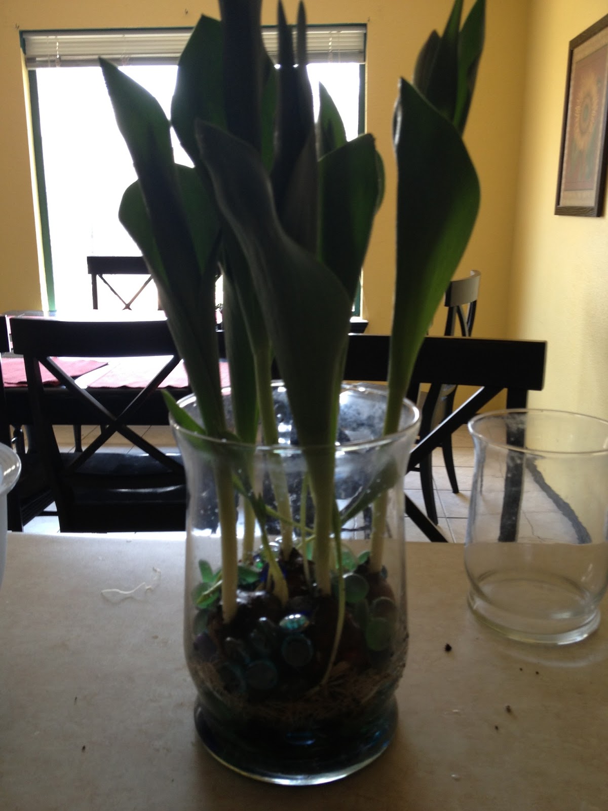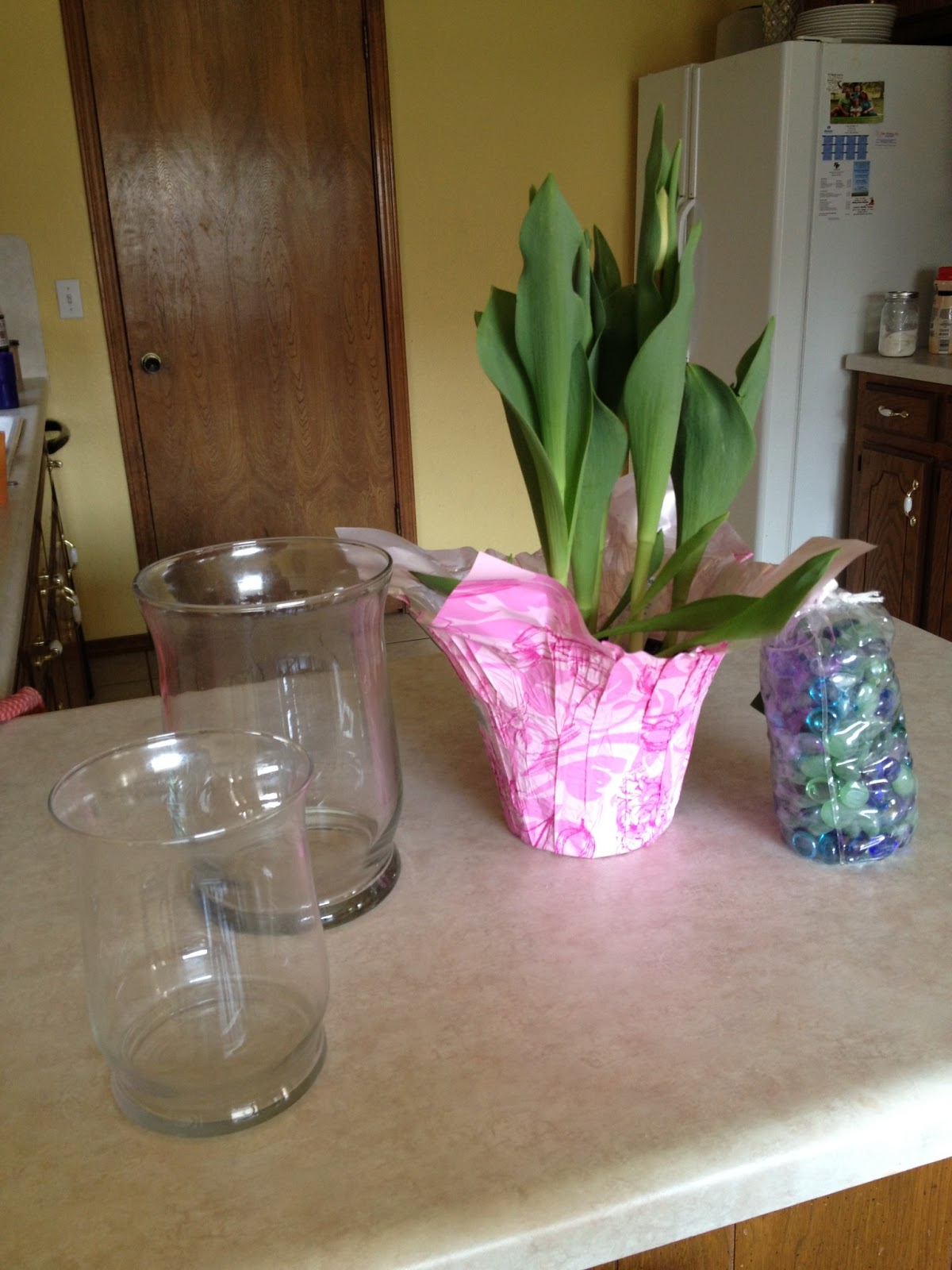 Tulips speak spring to me. I haven’t planted bulbs in years. I just can’t seem to remember!! But when I saw this post by Kim at Sand and Sisal I knew I had to try it. I love the looked of forced tulips in glass vases. I love that you can see all the parts, and I love that you can have that early bit of spring inside. But, you know I have told you that I am not a patient person….so when Kim also shared her “cheater” version I was on it. I found my perfect specimen at Aldi for $3.99!! Love it. Everything else I needed I had. So, here is what I started with.