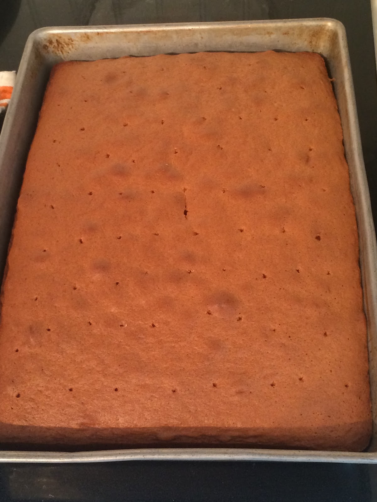 Poke holes in your warm cake.
