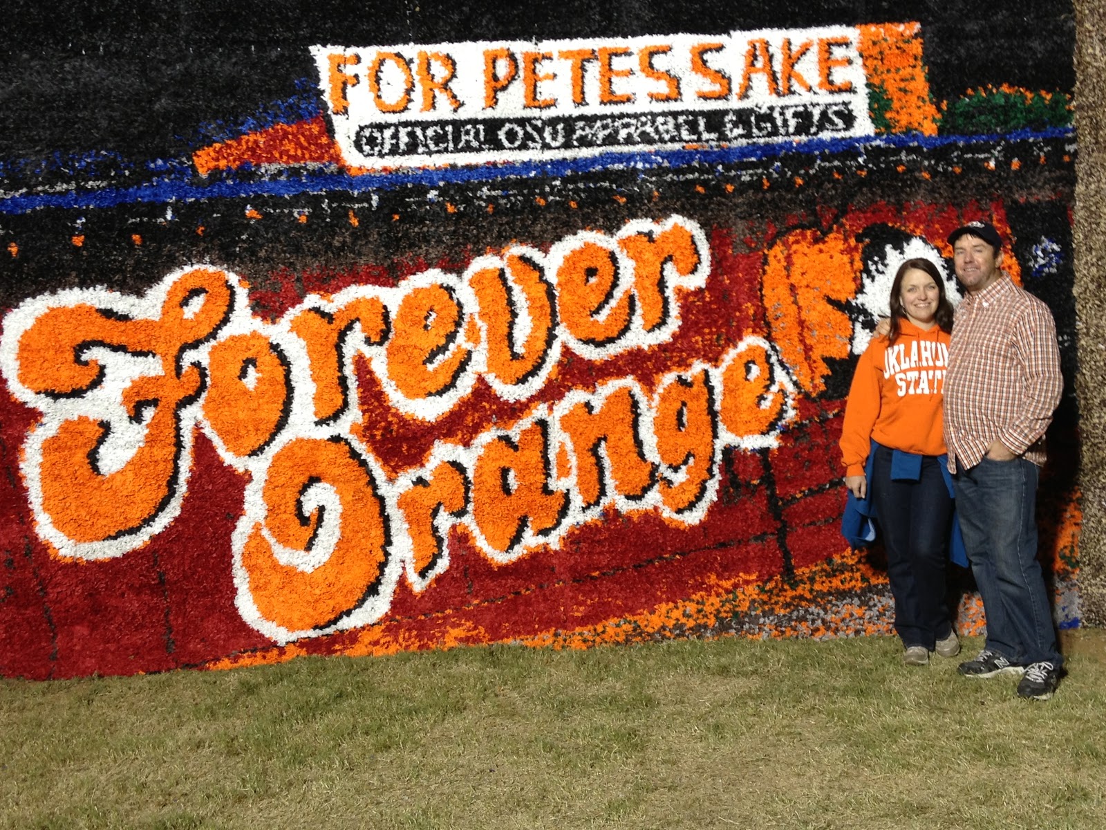 But, I wanted to share some fun times we had this weekend. First up was what we OSU (Oklahoma State University) alumni call “Walk Around”. Fancy name huh? Yes, well this is a homecoming tradition at OSU. Rather than floats the fraternities and sororities create “house decs” and on Friday night before the homecoming game, they shut down the streets around the house and EVERYONE comes out to “walk around” and check them out. It is quite a scene!! Here is a glimpse…