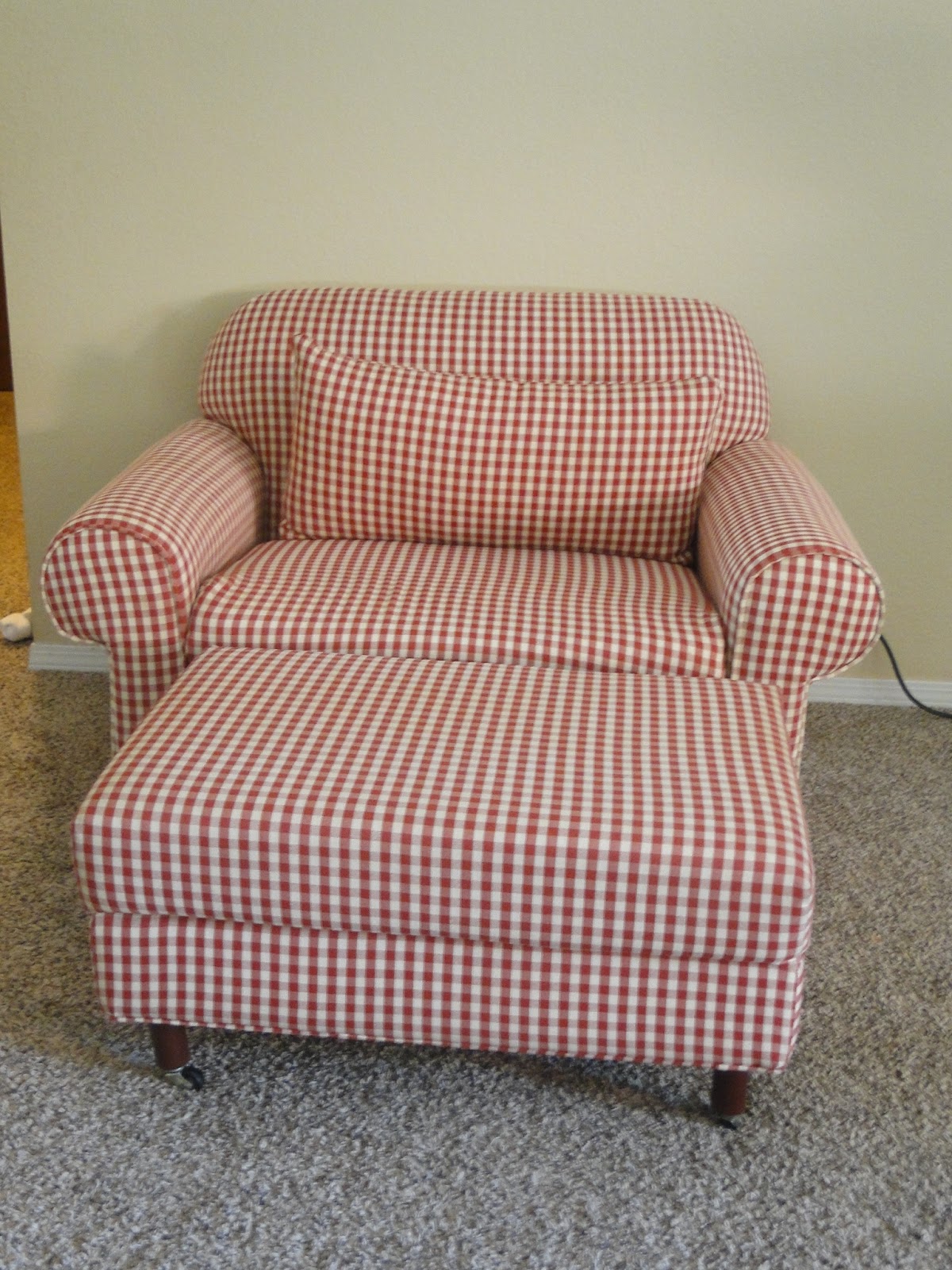 Chair and ottaman set in pretty good shape for $75, yes please!! Not sure if I will keep the red check and put it in our bedroom, or whether I will recover it. Definitely will be changing out those wimpy little legs. Those won’t last a week in my house of boys.