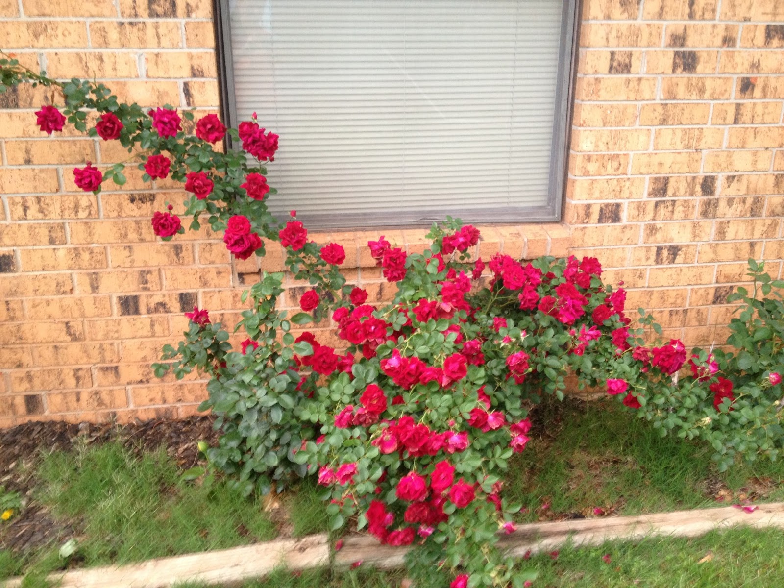 Oh well, moving on. I also transplanted a climbing rose bush which completely overtook a flower bed that is in front of our master bedroom window. This is what it looked like in full glory before I moved it – see a little unruly, and crowding out the other regular rose bushes in that bed (please ignore all the grass growing in there).