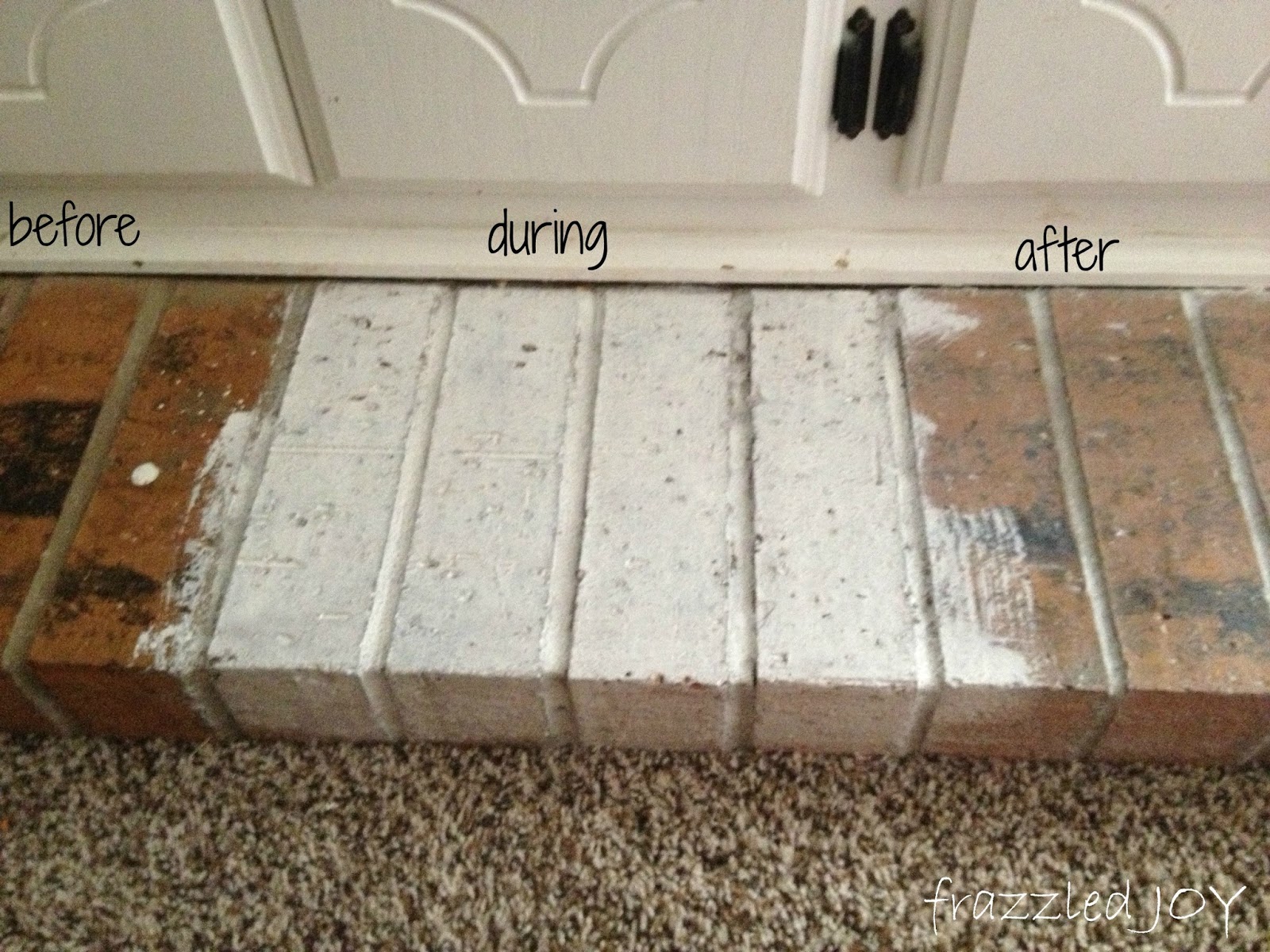 I have never been a fan of painted brick. I don’t know why, it’s just not my thing. With that said, I do not like the color of the brick on our house. It has that same orange glow that everything in the house has. It’s fine outside – I mean I can live with it, we painted the trim in such a way that it seems to tone it down. But, inside – ick. I knew I would never paint it, but then over the past year I have seen several white-washed looks floating around. I was intrigued. I liked that, depending on how much paint you used, you could still see the brick look. So, in light of my current circumstances, I decided why not – what else could go wrong- right (never say that by the way ;)).