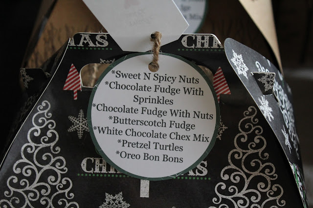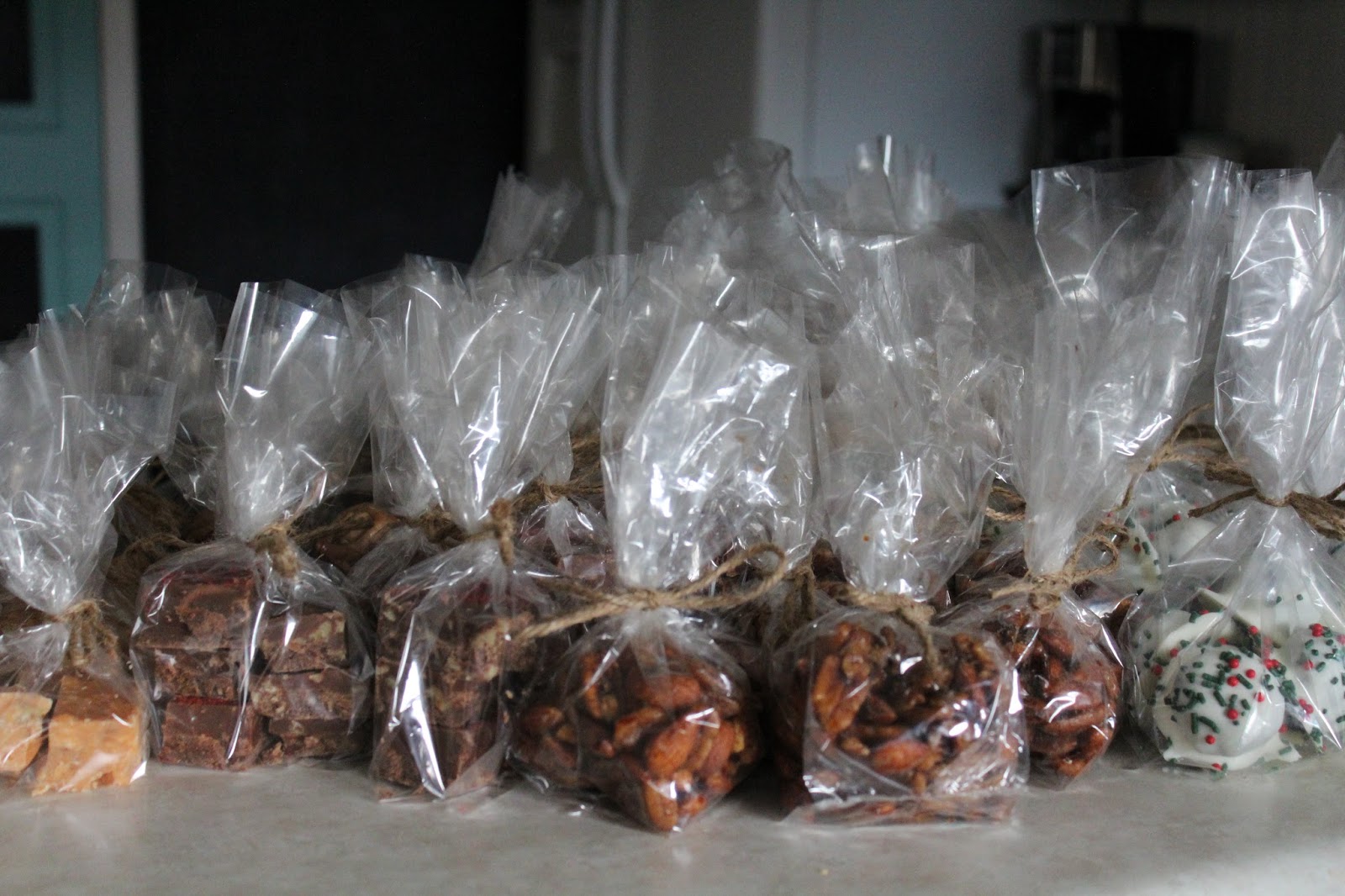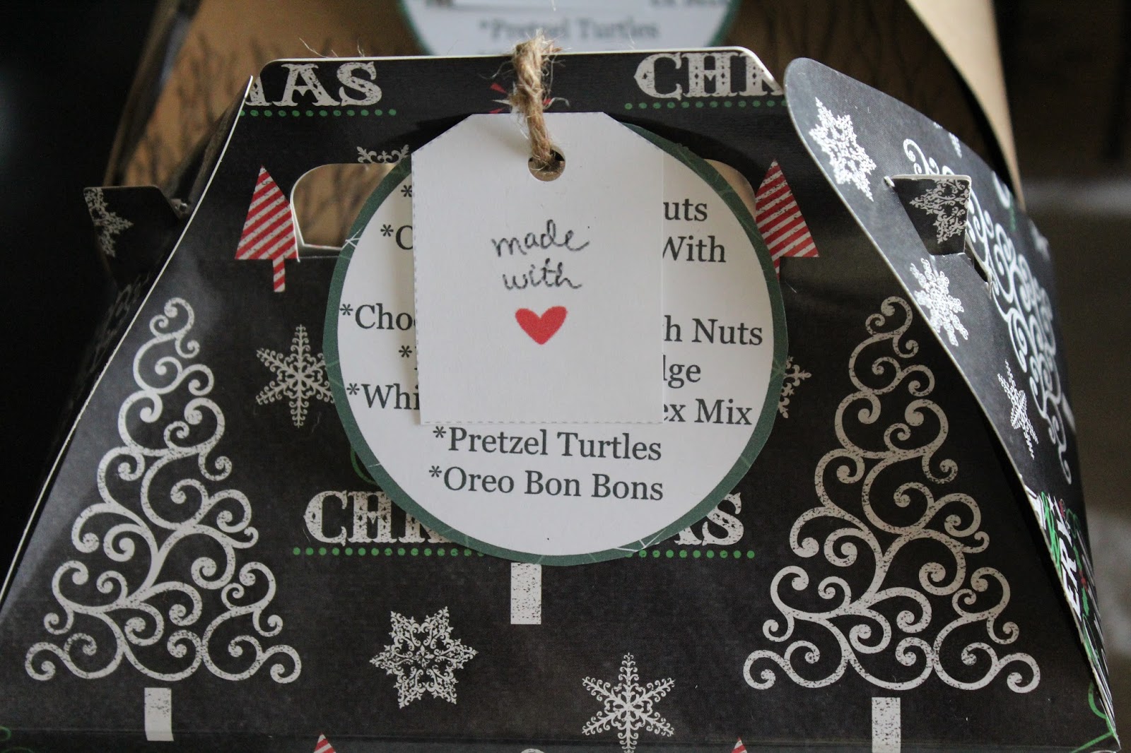 Simple pre-made boxes with plenty of room. I have used tins in the past, and I have even just used a gift bag. I like to get a little creative with the packaging and make it look cute! These year each treat was placed in a cello bag and tied up with twine.